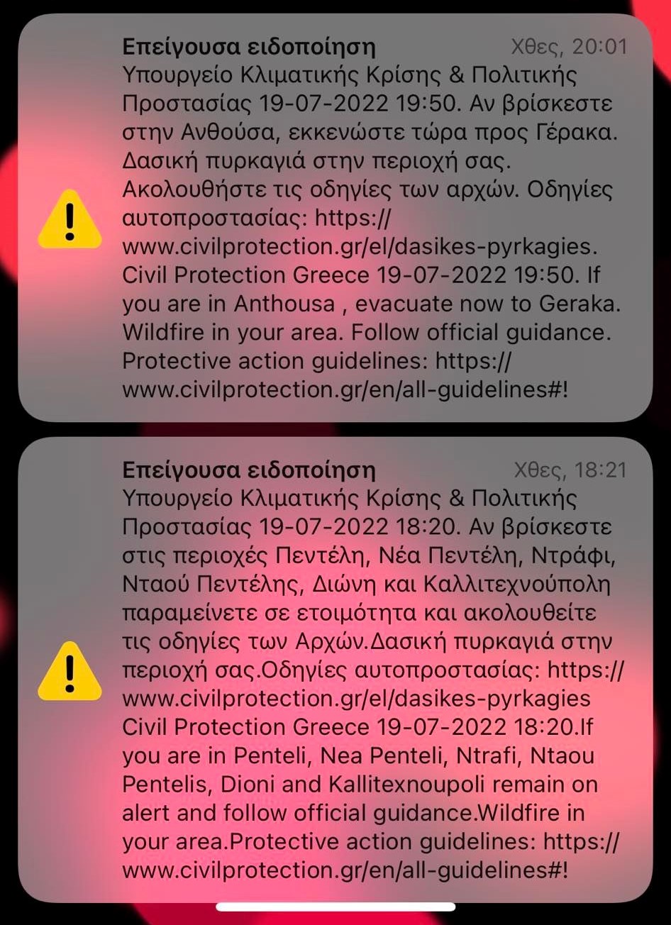 “Το μήνυμα από το 112 άργησε να έρθει. Ήρθε δηλαδή κατά τις 18.30 (μια ώρα αργότερα), και αρχικά δεν ήταν για εκκένωση, αλλά για να είμαστε σε ετοιμότητα. Το μήνυμα της εκκένωσης νομίζω ήρθε 30-45 λεπτά αργότερα”.