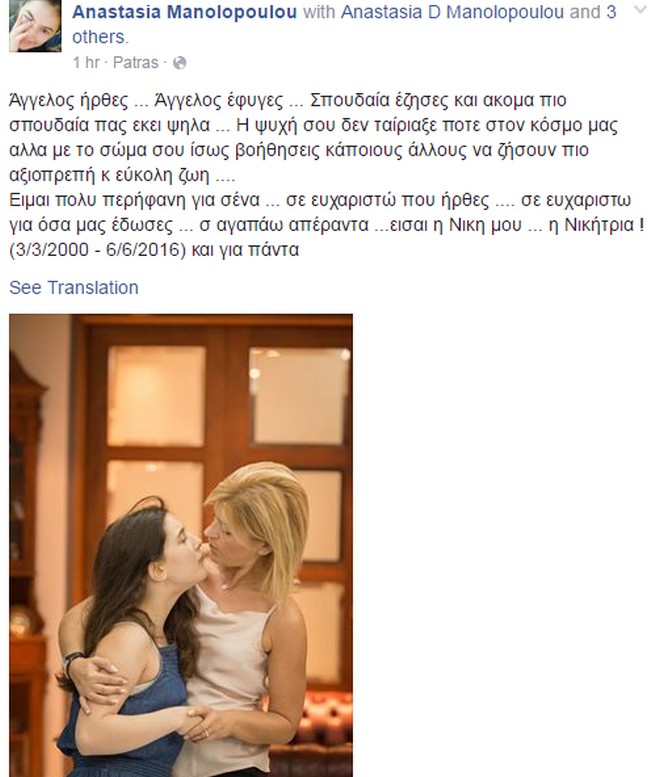 Τη θλιβερή είδηση γνωστοποίησε η μητέρα της, Τασία Μανωλοπούλου, η οποία με ανάρτηση της στο facebook, αποχαιρέτησε την αγαπημένη της κόρη.