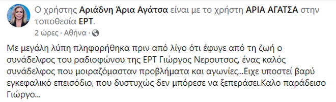 “Με μεγάλη λύπη πληροφορήθηκα πριν από λίγο ότι έφυγε από τη ζωή ο συνάδελφος του ραδιοφώνου της ΕΡΤ Γιώργος Νερούτσος, ένας καλός συνάδελφος που μοιραζόμασταν προβλήματα και αγωνίες…Είχε υποστεί βαρύ εγκεφαλικό επεισόδιο, που δυστυχώς δεν μπόρεσε να ξεπεράσει. Καλό παράδεισο Γιώργο…” έγραψε η ίδια.