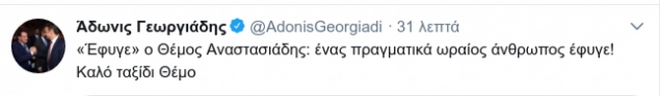 Ο αντιπρόεδρος της Νέας Δημοκρατίας, Άδωνις Γεωργιάδης έγραψε στο Twitter: «”Έφυγε” ο Θέμος Αναστασιάδης: ένας πραγματικά ωραίος άνθρωπος έφυγε! Καλό ταξίδι Θέμο».