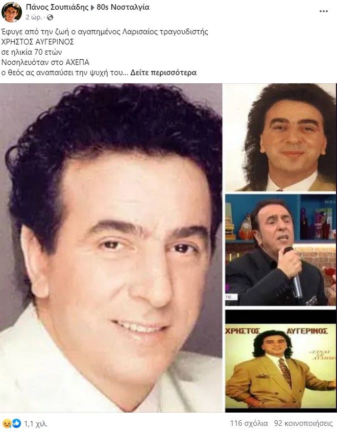 Έφυγε από τη ζωή, σε ηλικία 70 ετών, ο λαϊκός τραγουδιστής Χρήστος Αυγερινός, ο οποίος τις τελευταίες μέρες νοσηλευόταν στο ΑΧΕΠΑ.