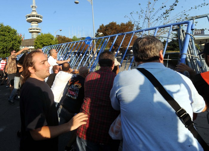 Οι αυτοκινητιστές, οι οποίοι είχαν κάνει νωρίτερα κατάληψη στο χώρο μπροστά στη νότια πύλη της Διεθνούς Έκθεσης Θεσσαλονίκης (ΔΕΘ) πέταξαν προς τις διμοιρίες των ΜΑΤ που φυλάσσουν το συνεδριακό κέντρο “Ι. Βελλίδης” μπουκάλια και άλλα αντικείμενα και οι αστυνομικοί απάντησαν με περιορισμένη χρήση χειροβομβίδων κρότου-λάμψης.