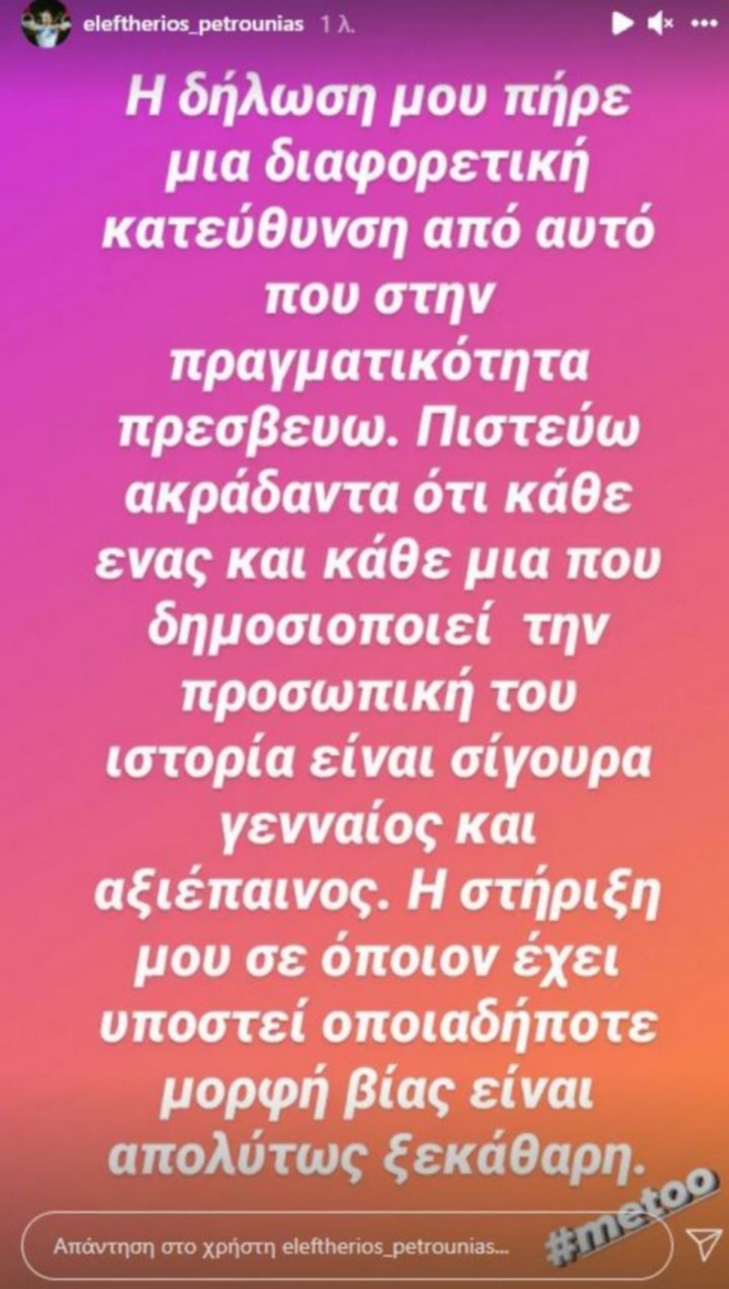 Ο Ολυμπιονίκης των κρίκων, Λευτέρης Πετρούνιας, θέλησε να τοποθετηθεί μέσω Instastory και να διευκρινίσει το τι ακριβώς εννοούσε σε απάντηση που έδωσε για το κίνημα #metoo.