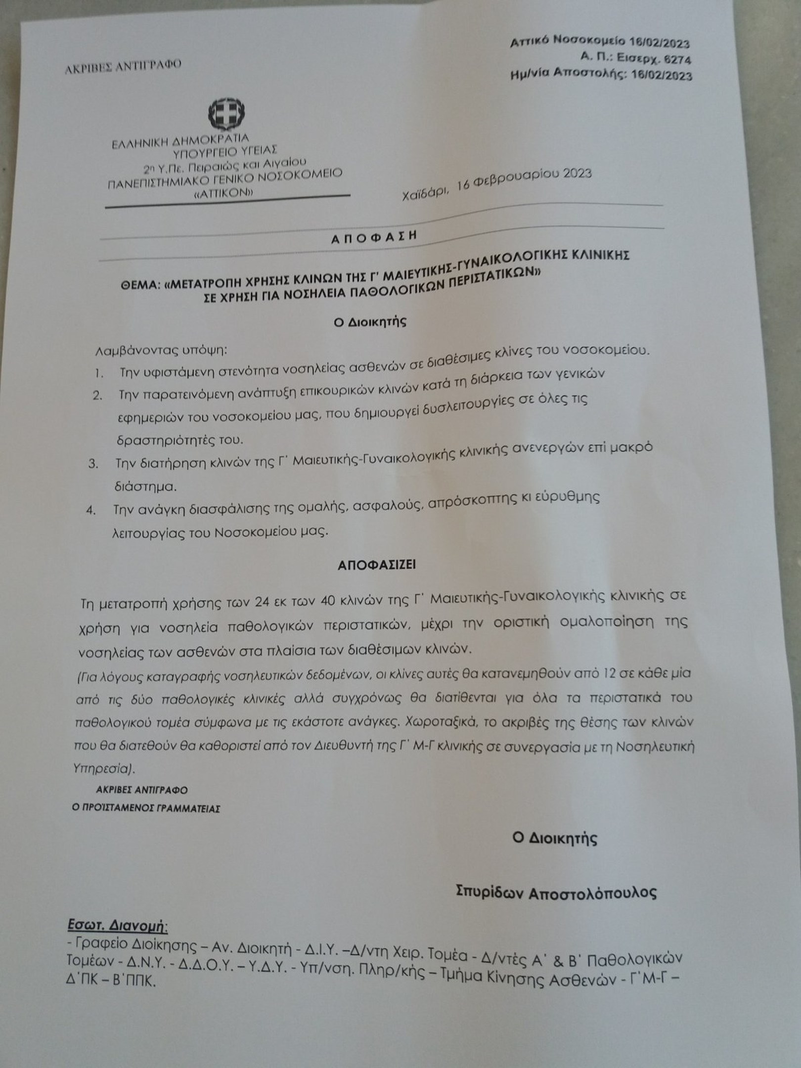 “Ο Διοικητής του Νοσοκομείου ΑΤΤΙΚΟΝ για να κρύψει τα ράντζα του νοσοκομείου εξέδωσε επικίνδυνη απόφαση για διάθεση 24 κλινών της ΜΑΙΕΥΤΙΚΗΣ, ΓΥΝΑΙΚΟΛΟΓΙΚΗΣ ΚΛΙΝΙΚΗΣ που διαθέτει συνολικά 40 κλίνες, σε περιστατικά του παθολογικού τομέα”, αναφέρει η ΠΟΕΔΗΝ στην ανακοίνωσή της.