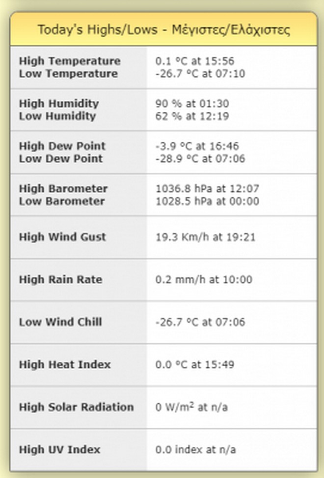 Στις 17/1/2012, ο σταθμός κατέγραψε την εξωπραγματική ελάχιστη θερμοκρασία των -35,3ºC, ενώ στις 26/1/2011 καταγράφηκε η πολική ελάχιστη θερμοκρασία των -32,5ºC, ανάλογη τιμή με της Ισπανίας και έτσι αι οι δυο αυτές θερμοκρασίες αποτελούν ρεκόρ ελαχίστων θερμοκρασιών για τα Ελληνικά δεδομένα. Θα συμπλήρωνα μέχρι στιγμής ….