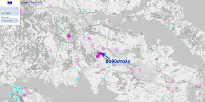 Όπως μπορούμε να παρατηρήσουμε στον παραπάνω χάρτη οι παρακείμενες ελάχιστες θερμοκρασίες ήταν πολύ υψηλότερες , ενω πολύ κοντά στην περιοχή του σταθμού συνέβη αυτό το “παράξενο φαινόμενο και η θερμοκρασία έπεσε πάρα πολύ .