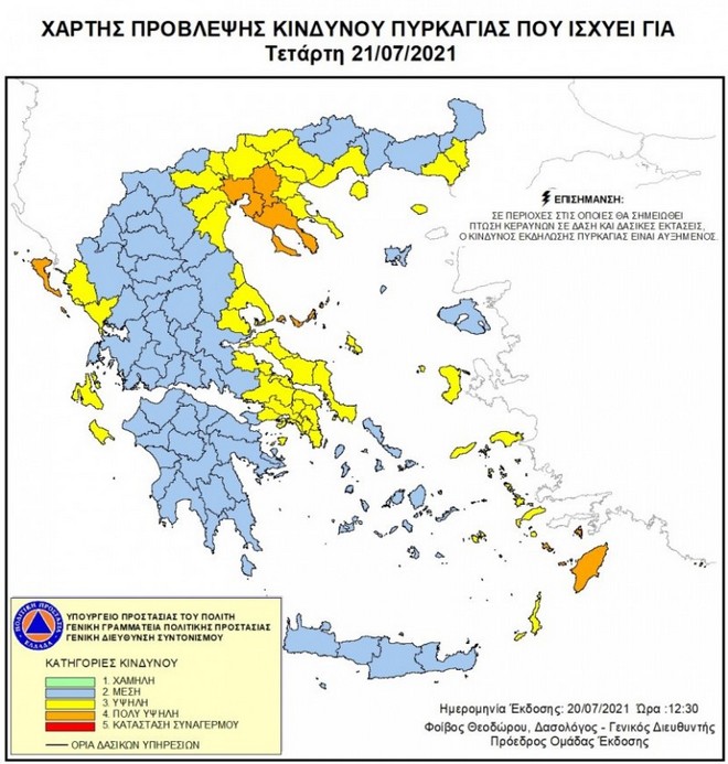 Πολύ υψηλός κίνδυνος πυρκαγιάς (κατηγορία κινδύνου 4) προβλέπεται για την Τετάρτη 21/7 για τέσσερις Περιφέρειες της χώρας, σύμφωνα με τον Χάρτη Πρόβλεψης Κινδύνου Πυρκαγιάς που εκδίδει η γενική γραμματεία Πολιτικής Προστασίας.