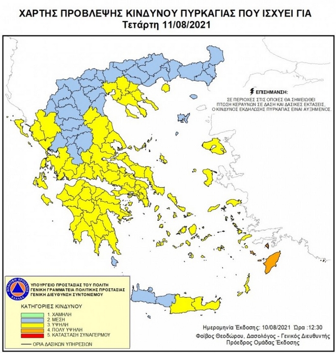 Σύμφωνα με το Χάρτη Πρόβλεψης Κινδύνου Πυρκαγιάς που εκδίδει η Γενική Γραμματεία Πολιτικής Προστασίας του Υπουργείου Προστασίας του Πολίτη για σήμερα Τετάρτη 11 Αυγούστου 2021, προβλέπεται πολύ υψηλός κίνδυνος πυρκαγιάς (κατηγορία κινδύνου 4) για τις εξής περιοχές: