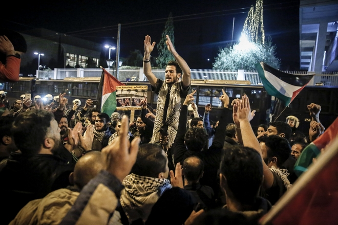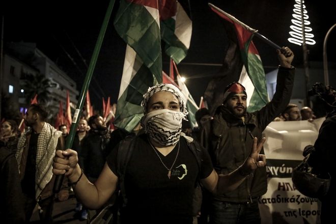 Παλαιστίνιοι συγκεντρώθηκαν το απόγευμα της Δευτέρας στην πλατεία Συντάγματος και κατευθύνθηκαν προς την αμερικανική πρεσβεία, διαμαρτυρόμενοι για την αναγνώριση από τις ΗΠΑ της Ιερουσαλήμ ως πρωτεύουσα του Ισραήλ.