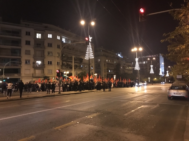 Παράλληλα, 500 περίπου μέλη της ΚΝΕ συγκεντρώθηκαν στα Προπύλαια και πραγματοποίησαν επίσης πορεία προς την πρεσβεία των ΗΠΑ, φωνάζοντας μεταξύ άλλων συνθήματα όπως ‘ΗΠΑ – Ισραήλ ματώνουν την Παλαιστίνη’.