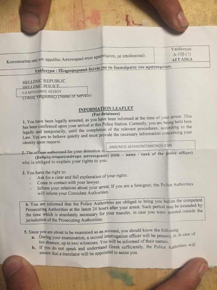 Το φυλλάδιο μάλιστα που πλέον διανέμουν οι αστυνομικές Αρχές σε όσους φτάνουν στο νησί, προκειμένου να γνωρίζουν τα νόμιμα δικαιώματά τους, είναι το παρακάτω:
