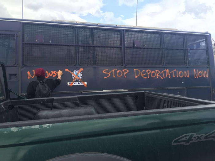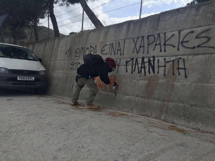 Όπως σημειώνει ο Σύριος εθελοντής τους τελευταίους τέσσερις μήνες στο νησί τη Λέσβου, Rafat Alhamoud, “η προσαγωγή έγινε, καθότι ο νεαρός εθελοντής έγραψε με σπρέι σε κλούβα της αστυνομίας: Σταματήστε την απέλαση τώρα (Stop Deportation Now)”.
