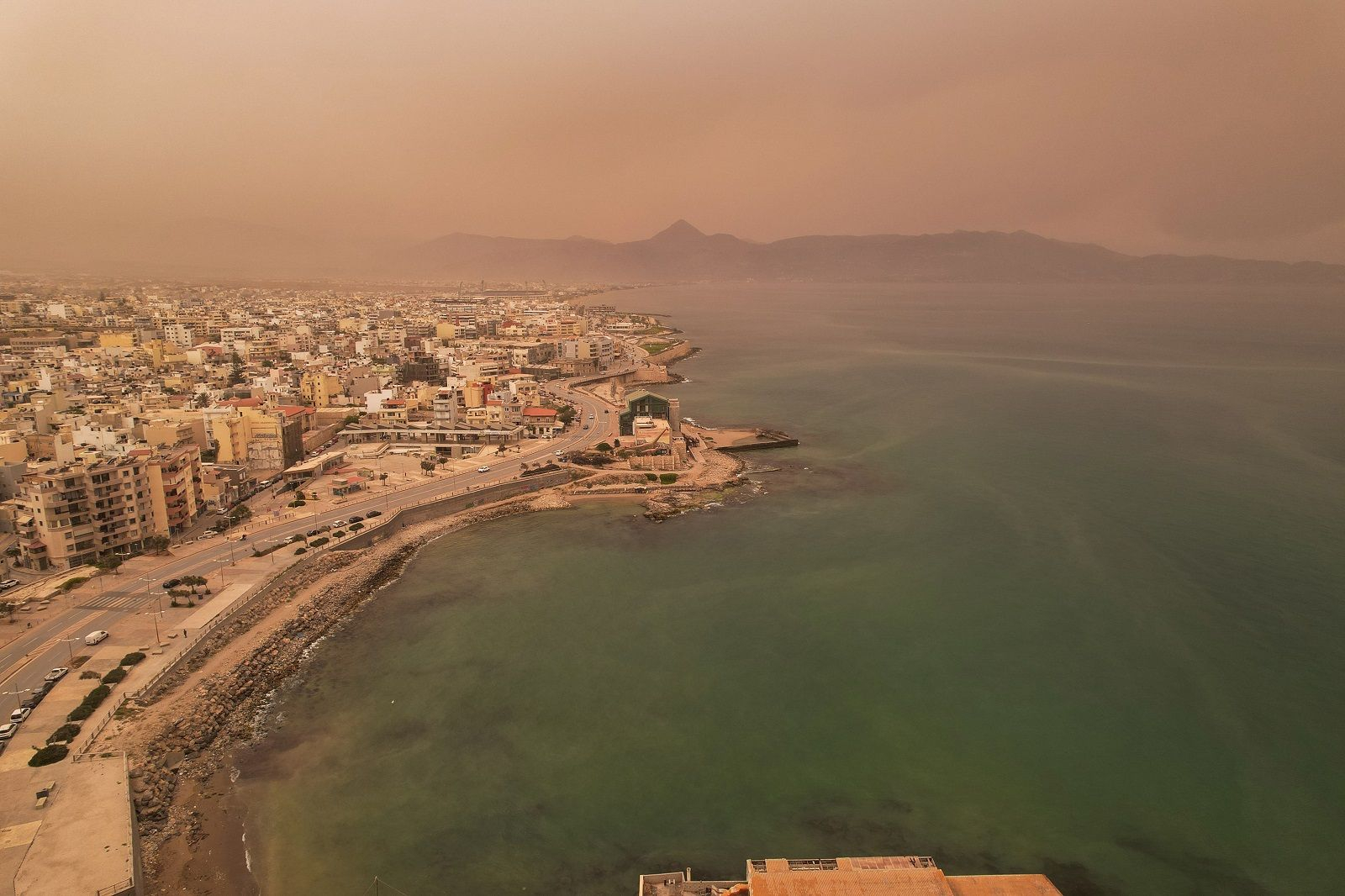 Στιγμιότυπο από το Ηράκλειο Κρήτης το απόγευμα της Κυριακής 25 Μαΐου 2025. Σκόνη από την Αφρική κάλυψε την πόλη. Για δεύτερη συνεχόμενη ημέρα το νησί πλήττεται από υψηλές συγκεντρώσεις αφρικανικής σκόνης σε συνδυασμό με έντονους νοτιάδες, δημιουργώντας μια ιδιαίτερα αποπνικτική ατμόσφαιρα σε πολλές περιοχές.