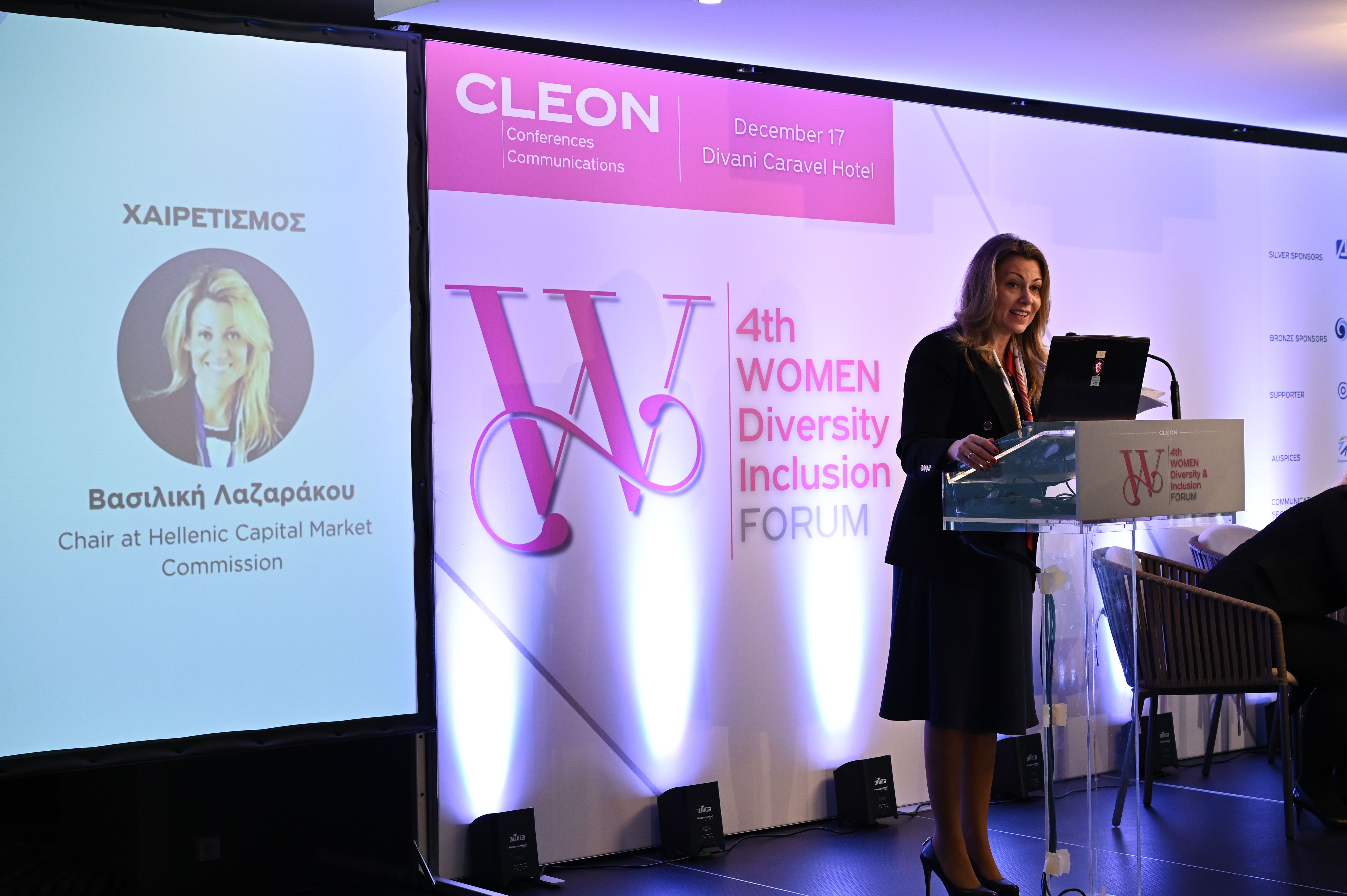 Απευθύνοντας χαιρετισμό στο 4th “Women – Diversity & Inclusion Forum”, η Βασιλική Λαζαράκου, Chair at Hellenic Capital Market Commission, ανέφερε, μεταξύ άλλων, πως «το ζητούμενο σε μια κοινωνία είναι να μπορεί να αξιοποιήσει το σύνολο του δυναμικού της ανεξάρτητα από το φύλο».