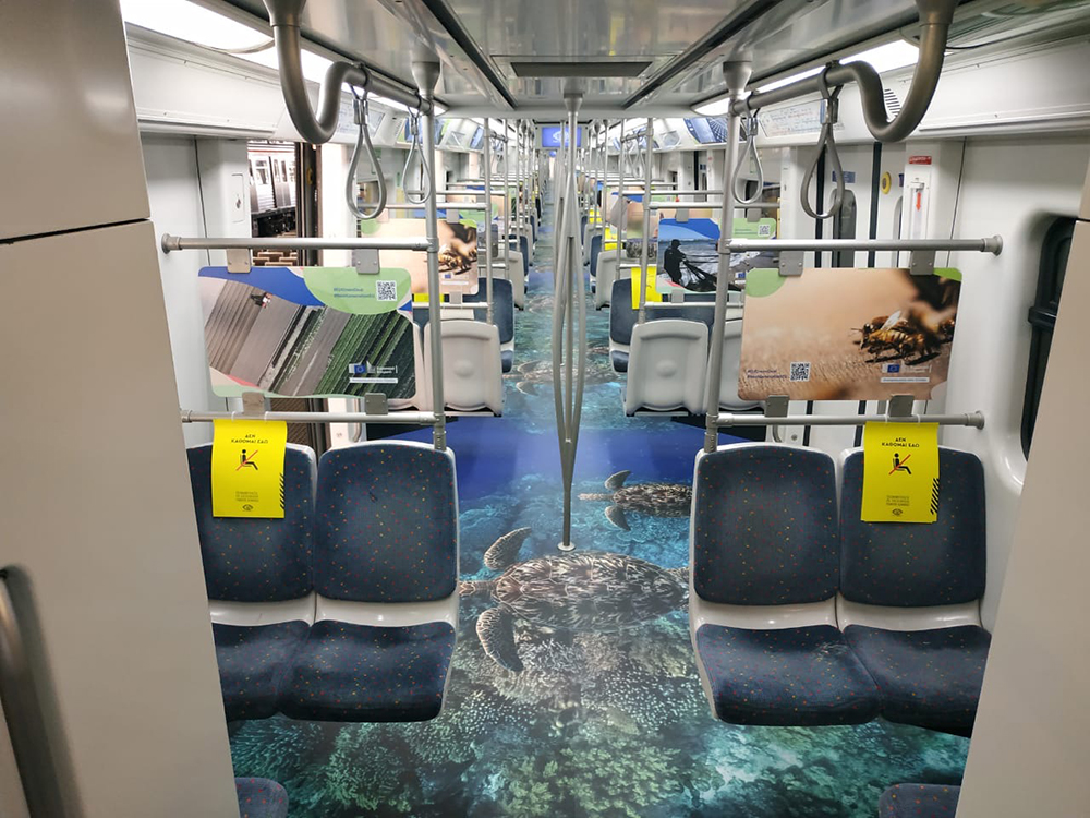 Ενδιαφέρουσα έκπληξη για το επιβατικό κοινό του Μετρό της Αθήνας. Οι πολίτες οι οποίοι χρησιμοποίησαν το μετρό από τις αρχές της εβδομάδας ανακαλύψαν ένα νέο και μαγευτικό κόσμο γεμάτο χρώματα και εικόνες της φύσης. Η Αντιπροσωπία της Ευρωπαϊκής Επιτροπής στην Ελλάδα, διαμόρφωσε ένα φιλικό περιβάλλον ενημέρωσης των πολιτών για την Ευρωπαϊκή Πράσινη Συμφωνία στους συρμούς και στις αποβάθρες του σταθμού «Σύνταγμα» στο Μετρό της Αθήνας.