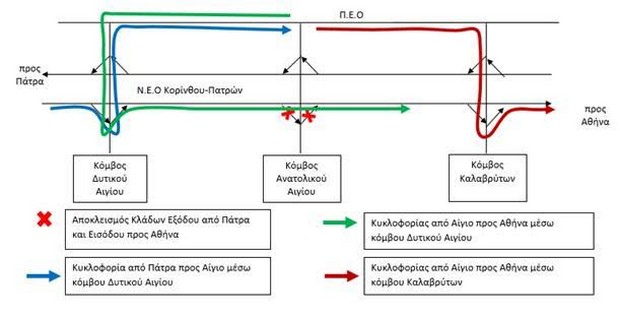 Η κυκλοφορία της ΝΕΟ από Πάτρα προς Αίγιο θα εξυπηρετείται από τον Κόμβο Δυτικού Αιγίου και η κυκλοφορία από Αίγιο προς Αθήνα θα διεξάγεται μέσω της ΠΕΟ και θα εισέρχεται στη ΝΕΟ Κορίνθου – Πατρών είτε μέσω του κόμβου Δυτικού Αιγίου είτε μέσω του κόμβου Καλαβρύτων, όπως φαίνεται στο ακόλουθο σχηματικό διάγραμμα.
