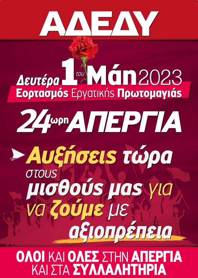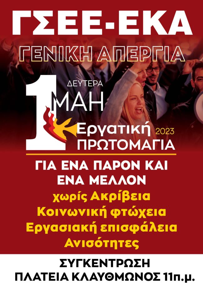 «Η ΓΣΕΕ καλεί όλους τους εργαζόμενους, τους συνταξιούχους, τους ανέργους, στην 24ωρη Γενική Απεργία για την Εργατική Πρωτομαγιά, την Δευτέρα 1η Μαΐου, στο Συλλαλητήριο των Συνδικάτων στις 11.00 το πρωί στην Πλατεία Κλαυθμώνος και στις κατά τόπους εκδηλώσεις των Εργατικών Κέντρων, συμμετέχοντας στην παγκόσμια ημέρα αλληλεγγύης και αγώνων για τα συλλογικά και ατομικά δικαιώματα των εργαζομένων, την κοινωνική Δικαιοσύνη και την παγκόσμια Ειρήνη» αναφέρει η ανακοίνωση της Συνομοσπονδίας.
