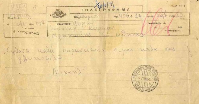 Τηλεγράφημα του Κύρκου Μιχάλη από τη Μακρόνησο προς τη σύζυγό του Ιωάννα, ΑΣΚΙ / Αρχείο Μιχάλη Κύρκου