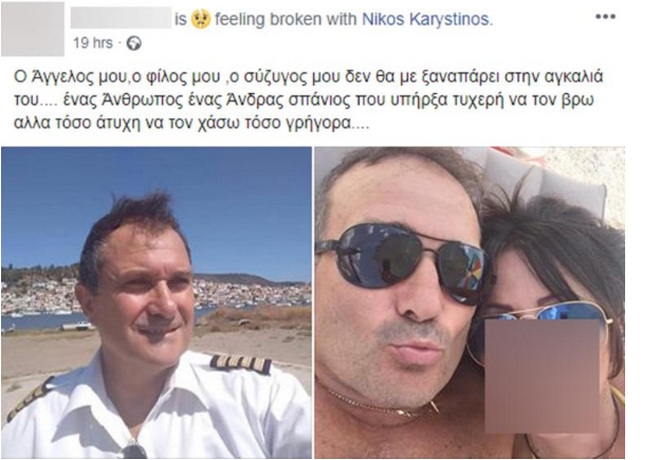 Τη μοναχοκόρη του πιλότου ακολούθησε η σύζυγός του, η οποία επίσης εξέφρασε τη θλίψη της για το δυστύχημα, μέσα από το Facebook.