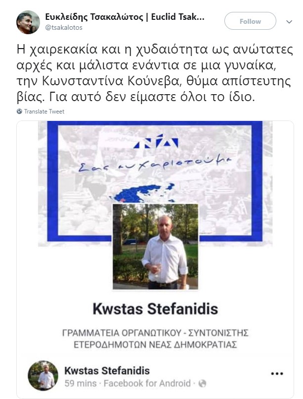 Αντιδράσεις για ανάρτηση του συντονιστή ετεροδημοτών της Νέας Δημοκρατίας ο οποίος καταφέρθηκε με απαράδεκτο τρόπο εναντίον της Κωνσταντίνας Κούνεβα. Αιχμηρό το σχόλιο του υπουργού Οικονομικών στο Twitter. Διεγράφη το στέλεχος με απόφαση Μητσοτάκη.