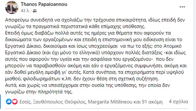 Επειδή όμως διαβάζω πολλά αυτές τις ημέρες για θέματα που αφορούν τα δικαιώματα των εργαζομένων και επειδή η επιστημονική μου ειδίκευση είναι το Εργατικό Δίκαιο, δικαιούμαι και ίσως υποχρεούμαι να πω το εξής: στο Ατομικό Εργατικό Δίκαιο (και όχι μόνο το ελληνικό) υπάρχουν πολλές διατάξεις -και ιδίως αυτές που αφορούν την υγεία και την ασφάλεια του εργαζομένου- που δεν μπορούν να παραβιασθούν ακόμη και εάν ο εργαζόμενος συμφωνήσει, ακόμη και εάν δοθεί μεγάλη αμοιβή γι’ αυτές. Κατά συνέπεια, τα επιχειρήματα περί υψηλού μισθού, φιλοδωρημάτων κ.λπ. δεν έχουν θέση στη σχετική συζήτηση.