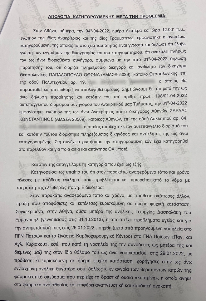 «Αρνούμαι τη κατηγορία. Αναφέρομαι στο από 04-04-2022 απολογητικό μου υπόμνημα, το περιεχόμενο του οποίου επιβεβαιώνω και ενώπιόν σας ως αληθές και διευκρινιστικά σε όσα με ρωτάτε σας απαντάω ως εξής.