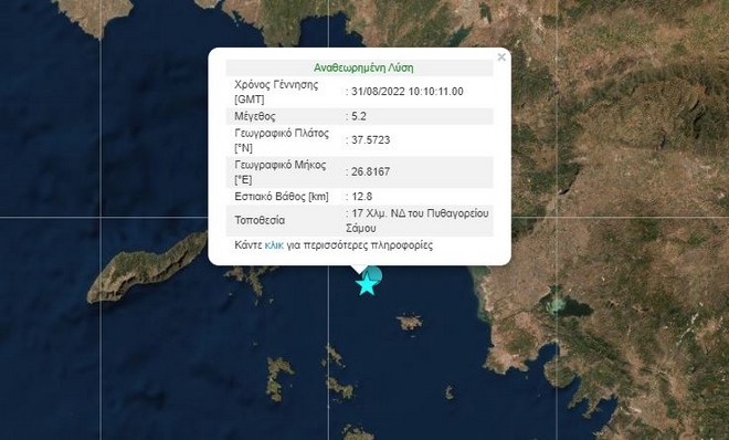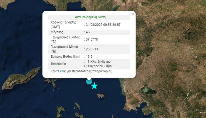 Σύμφωνα με το Γεωδυναμικό Ινστιτούτο, ο σεισμός έχει επίκεντρο 15 χιλιόμετρα νότια, νοτιοδυτικά του Πυθαγορείου Σάμου.