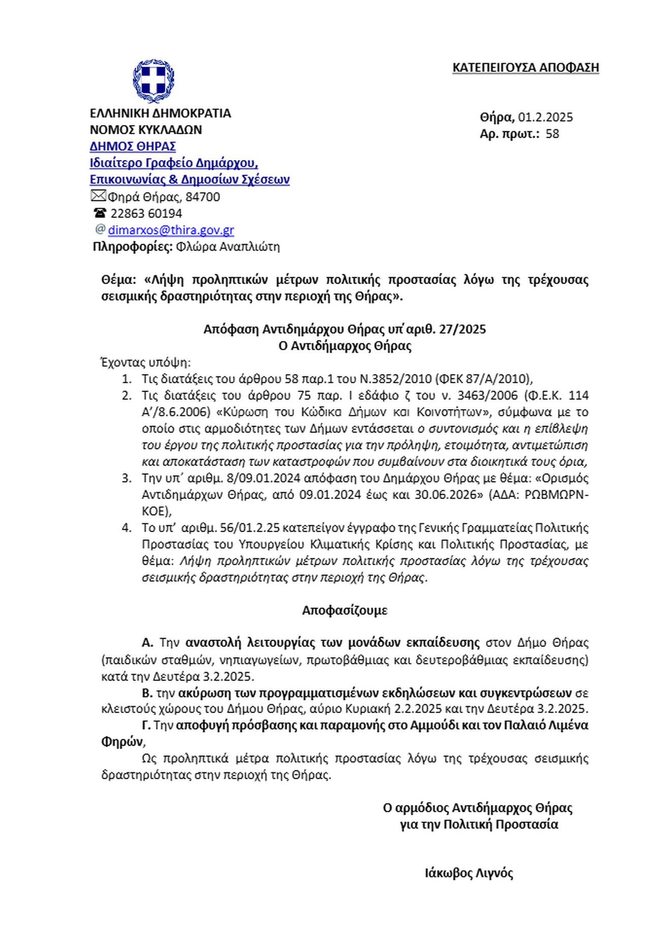 Δήμος Θήρας: Κλείνουν τα σχολεία, δεν πραγματοποιούνται εκδηλώσεις