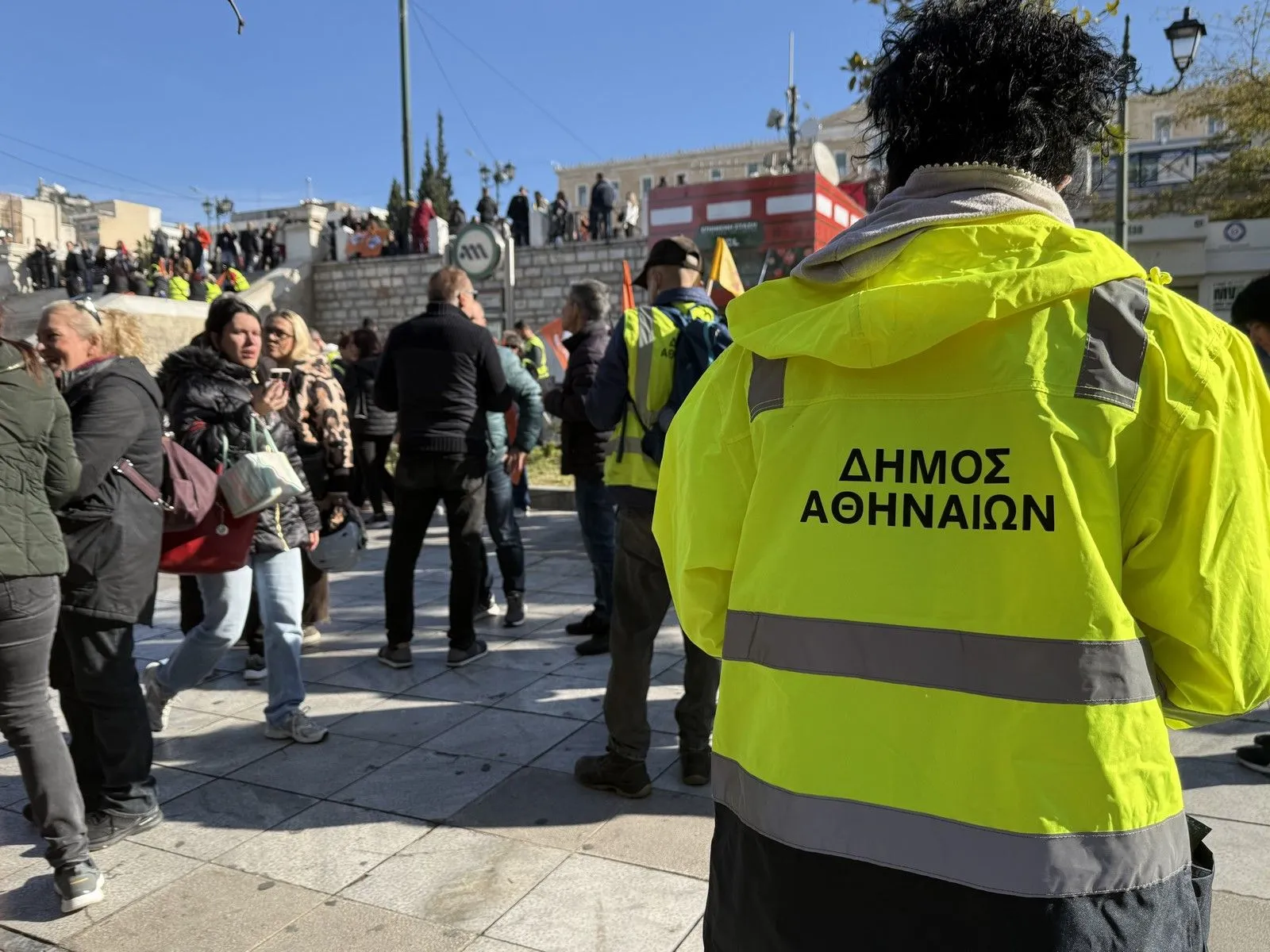 Δεκάδες ήταν, επίσης, οι εργαζόμενοι του Δήμου Αθηναίων που φορώντας τα κίτρινα γιλέκα τους διεκδικούν όπως δηλώνουν «δικαιοσύνη και εντιμότητα».