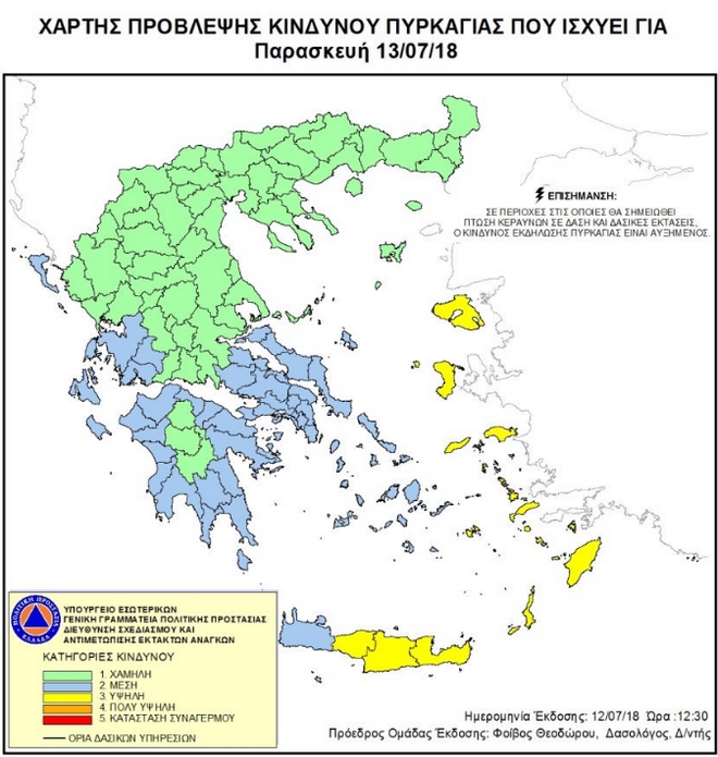 Για σήμερα, Παρασκευή 13 Ιουλίου, σύμφωνα με τον ημερήσιο χάρτη πρόγνωσης κινδύνου πυρκαγιών, που δημοσιεύει καθημερινά η Γενική Γραμματεία Πολιτικής Προστασίας, τον πιο υψηλό κίνδυνο να ξεσπάσουν τυχόν πυρκαγιές, διατρέχει η Κρήτη και τα νησιά του Βορείου και του Νοτίου Αιγαίου.