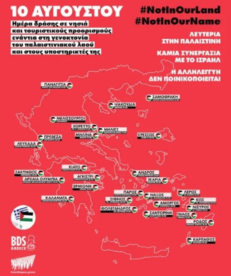 Αυτό το καλοκαίρι, όλα τα ματιά στρέφονται στη Γάζα και στον αγώνα της Παλαιστίνης για ζωή ενάντια στους βομβαρδισμούς και τη λιμοκτονία. Αυτό το καλοκαίρι, όπου βρισκόμαστε, παίρνουμε μαζί κεφίγιες, αυτοκόλλητα και παλαιστινιακές σημαίες και δίνουμε ραντεβού στις 10 Αυγούστου για να στείλουμε ξεκάθαρο μήνυμα: ΝOT IN OUR LAND – NOT IN OUR NAME. Κινητοποιούμαστε στα νησιά και σε κάθε τουριστικό προορισμό και φωνάζουμε δυνατά ότι στεκόμαστε στο πλευρό της Παλαιστίνης μέχρι τέλους.
