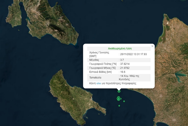 Σεισμός 3,7 βαθμών της κλίμακας Ρίχτερ σημειώθηκε το μεσημέρι της Κυριακής (20/11) στον θαλάσσιο χώρο μεταξύ Ζακύνθου και Κυλλήνης.