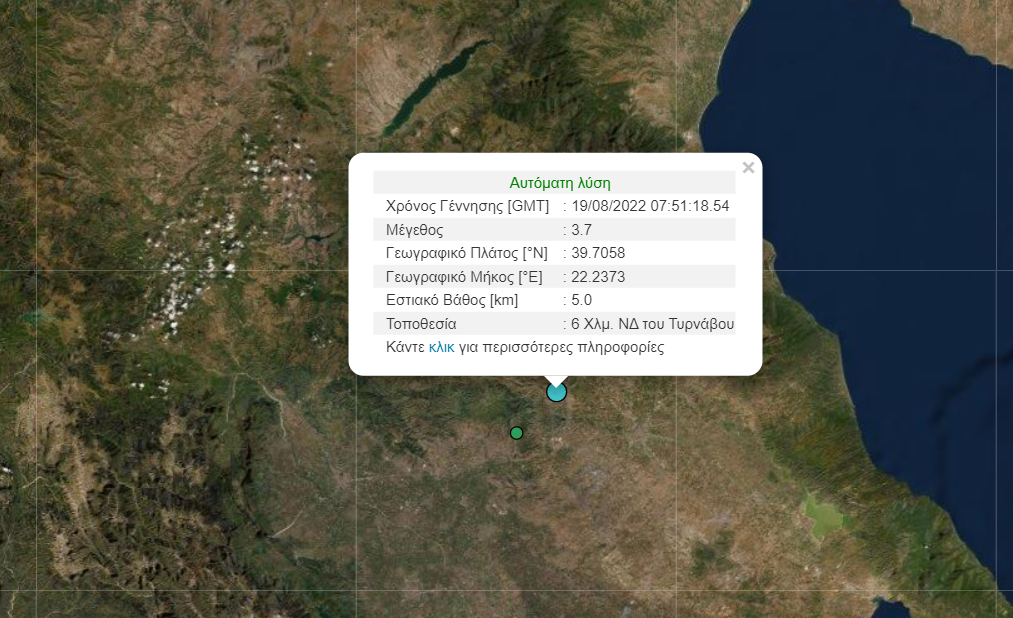 Σεισμική δόνηση μεγέθους 3,7 βαθμών της κλίμακας Ρίχτερ καταγράφηκε το πρωί της Παρασκευής (19/08) κοντά στον Τύρναβο.