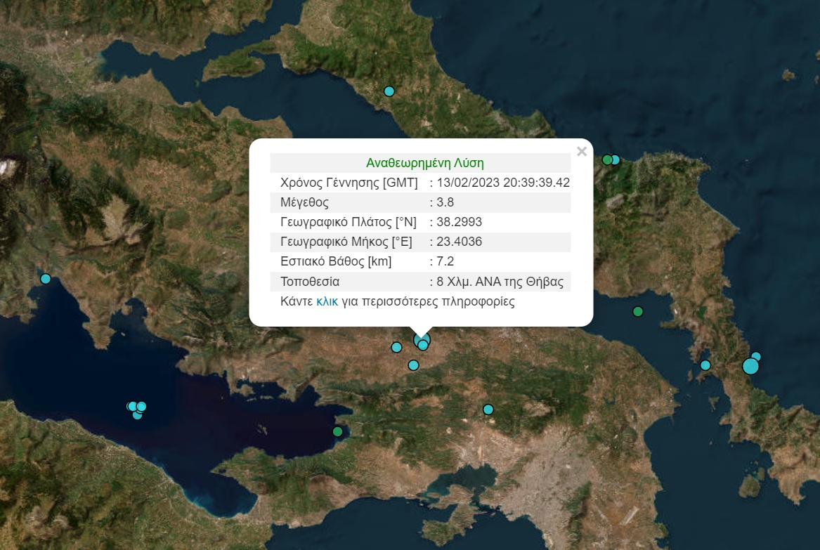 Σεισμός μεγέθους 3,8 Ρίχτερ σημειώθηκε το βράδυ της Δευτέρας (13/02) στη Βοιωτία και συγκεκριμένα 8 Χλμ. ανατολικά της Θήβας.