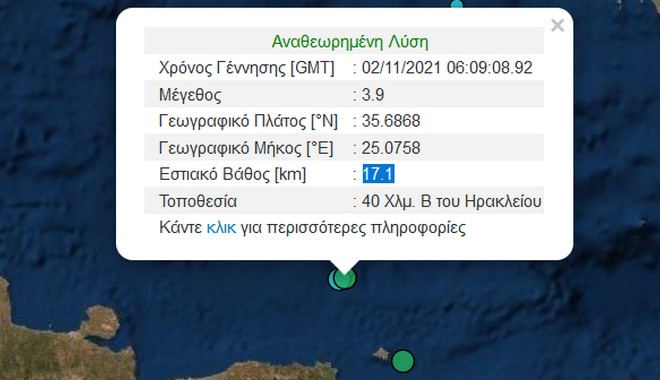 Ασθενής σεισμός μεγέθους 3,9 βαθμών της κλίμακας Ρίχτερ σημειώθηκε το πρωί της Τρίτης ανοιχτά της Κρήτης.