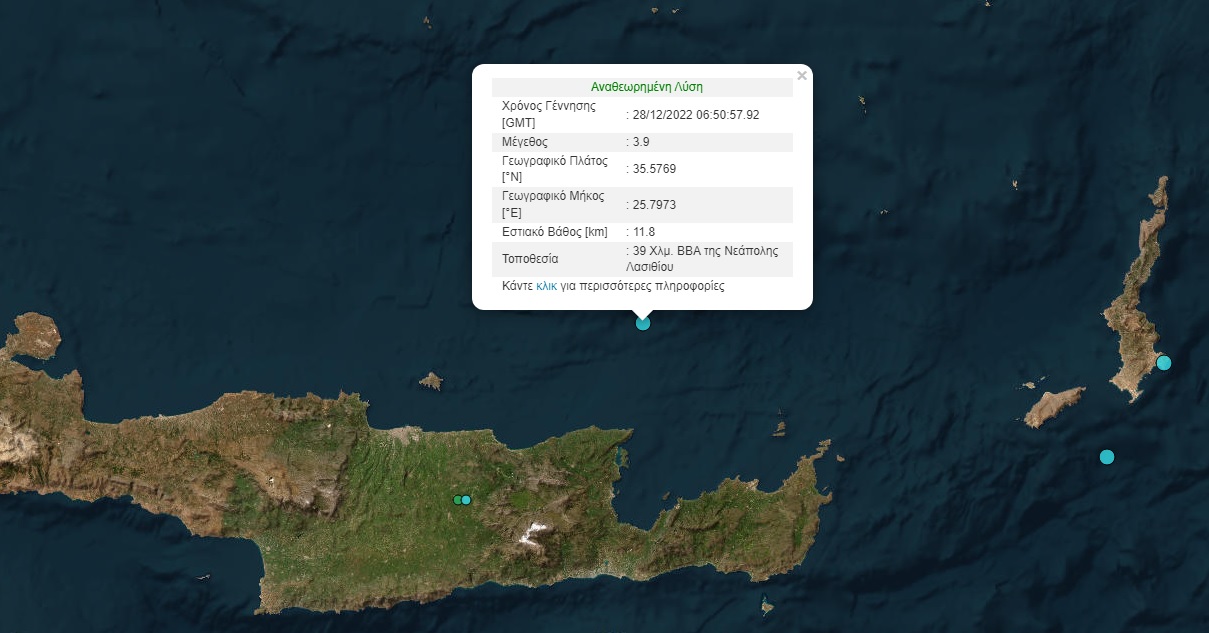 Σεισμός 3,9 Ρίχτερ σημειώθηκε ανοιχτά της Κρήτης το πρωί της Τετάρτης (28/12). 36 χλμ. βόρειο-ανατολικά της Νεάπολης Λασιθίου το επίκεντρό του.