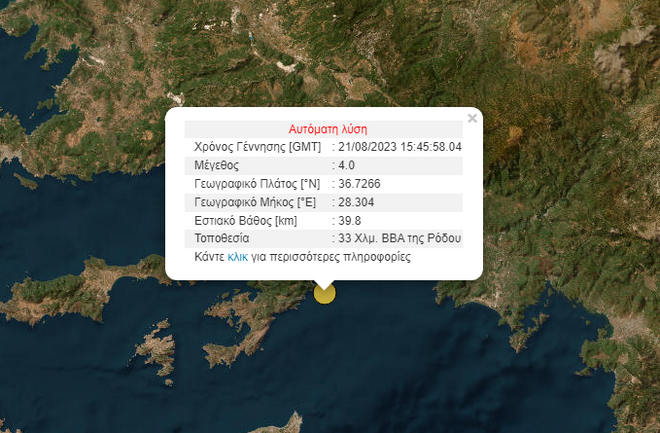 Σύμφωνα με την αυτόματη λύση του Γεωδυναμικού Ινστιτούτου Αθηνών, το επίκεντρο της δόνησης υπολογίζεται 33 χλμ. βόρεια-βορειοανατολικά της Ρόδου.