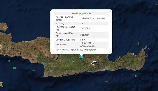 Σεισμική δόνηση μεγέθους 4,1 βαθμών της κλίμακας Ρίχτερ σημειώθηκε στις 11:22 το πρωί της Τετάρτης στην Κρήτη, στην περιοχή του Αρκαλοχωρίου.