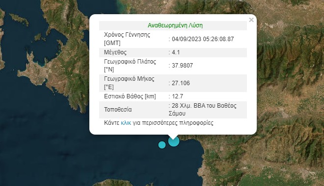 Σεισμός μεγέθους 4,1 βαθμών της Κλίμακας Ρίχτερ σημειώθηκε στις 08:26 ώρα Ελλάδος ανοιχτά της Σάμου.