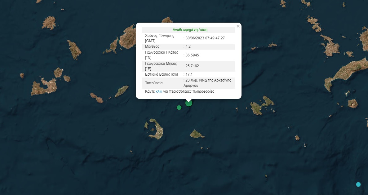 Η σεισμική δόνηση είχε εστιακό βάθος 17.1 χλμ και το επίκεντρό του εντοπίζεται στα 23 χλμ. Νοτιοδυτικά της Αρκεσίνης Αμοργού.