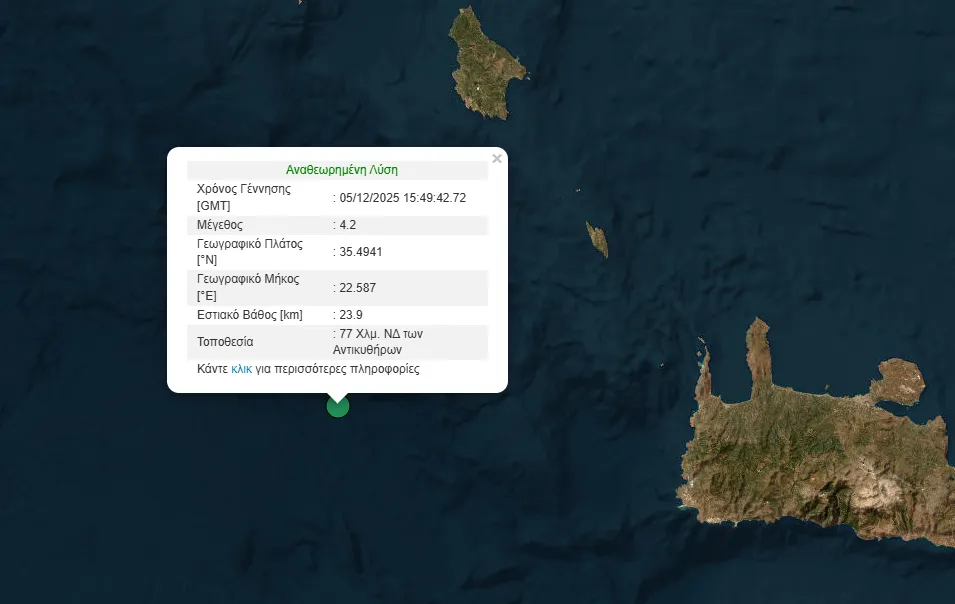 Σεισμική δόνηση μεγέθους 4,2 βαθμών της κλίμακας Ρίχτερ σημειώθηκε στις 18:49 το απόγευμα της Παρασκευής (5/12) ανοιχτά των Αντικυθήρων.