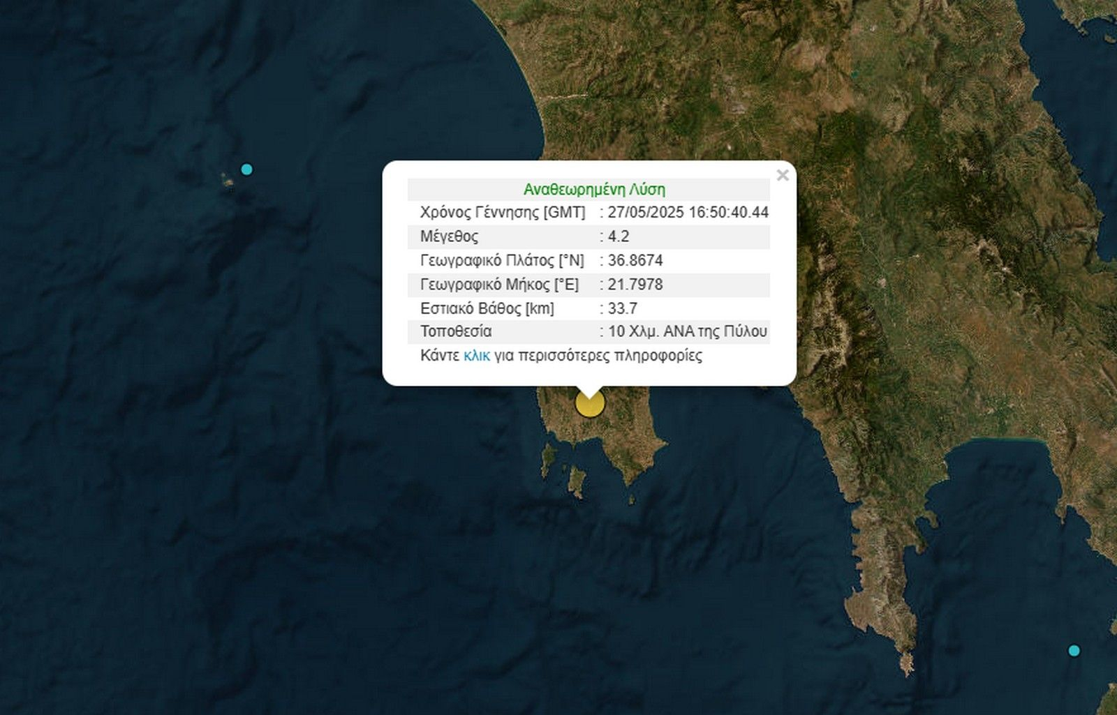 Σεισμός 4,2 βαθμών της κλίμακας Ρίχτερ σημειώθηκε το απόγευμα της Τρίτης (27/05) στην Μεσσηνία.