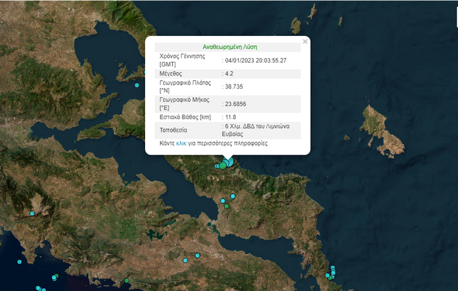 Σεισμός μεγέθους 4,1 της κλίμακας Ρίχτερ σημειώθηκε το βράδυ της Τετάρτης (04/01) στον Λιμνιώνα Ευβοίας.