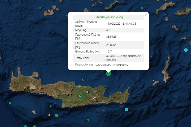 Σύμφωνα με το Γεωδυναμικό Ινστιτούτο, ο σεισμός είχε επίκεντρο 40 χιλιόμετρα βόρεια – βορειοανατολικά της Νεάπολης Λασιθίου, με εστιακό βάθος 15,7 χιλιόμετρα.