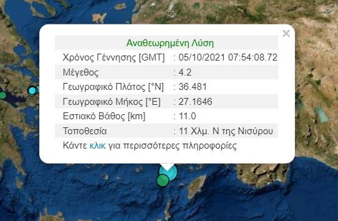 Σεισμός μεγέθους 4,2 βαθμών της κλίμακαρς Ρίχτερ σημειώθηκε στις 10.54 το πρωί της Τρίτης. Σύμφωνα με το Γεωδυναμικό Ινστιτούτο του Εθνικού Αστεροσκοπείου Αθηνών το επίκεντρο του σεισμού εντοπίζεται 11 χιλιόμετρα νότια της Νισύρου.