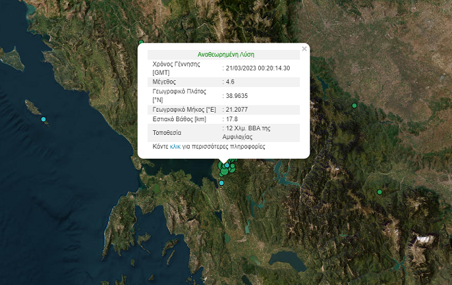 Σεισμός μεγέθους 4,6 βαθμών της κλίμακας Ρίχτερ σημειώθηκε τα ξημερώματα της Τρίτης (21/03) στην Αμφιλοχία.