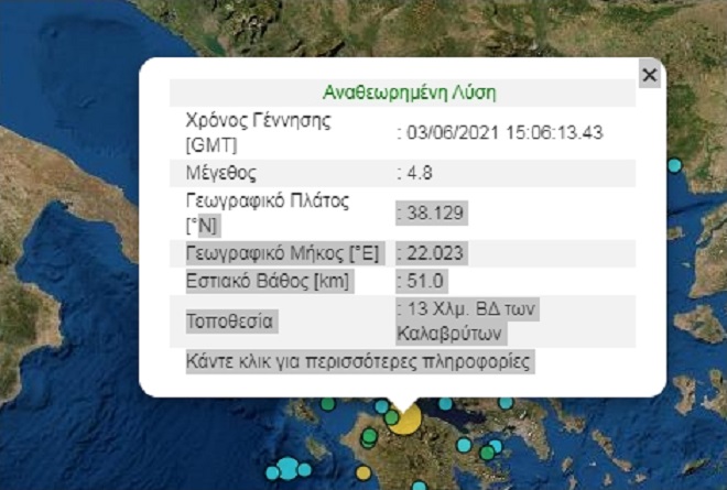 Πιο αναλυτικά, η σεισμική δόνηση σημειώθηκε στις 18:06, με επίκεντρο 13 χλμ. βορειοδυτικά των Καλαβρύτων ενώ το εστιακό βάθος ήταν στα 51 χλμ.