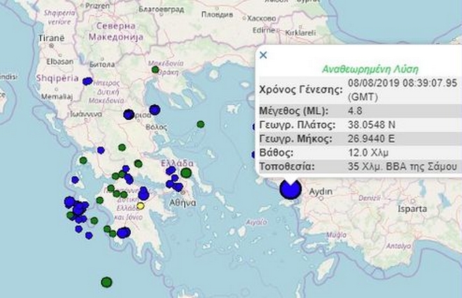 Σεισμός 4,8 βαθμών της κλίμακας Ρίχτερ σημειώθηκε στις 11:39 στον θαλάσσιο χώρο της Σάμου, σε απόσταση 283 χιλιόμετρα ανατολικά της Αθήνας.