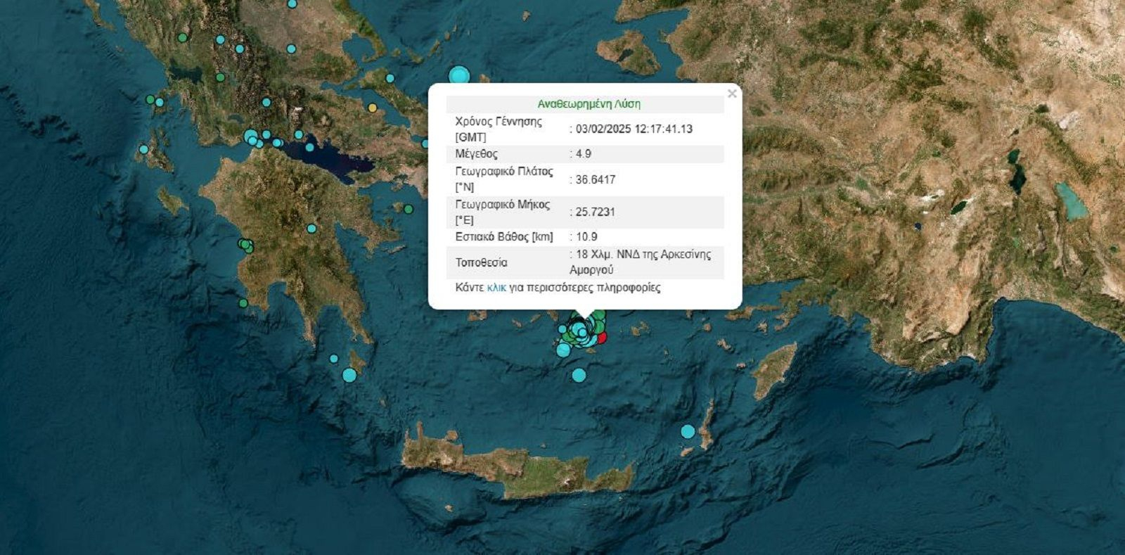 Σεισμός μεγέθους 4,9 βαθμών της κλίμακας Ρίχτερ, σημειώθηκε το μεσημέρι της Δευτέρας (03/02) στη θαλάσσια περιοχή μεταξύ Σαντορίνης και Αμοργού.