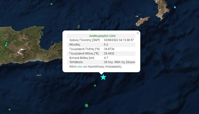 Δυνατός σεισμός 5,2 βαθμών της κλίμακας Ρίχτερ σημειώθηκε το πρωί του Σαββάτου (07:13) ανοιχτά της Κρήτης.